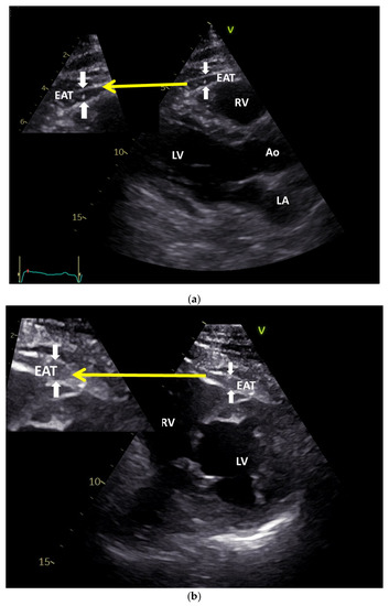 Epicardial fat by transthoracic echocardiography. (a). Epicardial fat thickness at parasternal long axis (the distance from outer side of myocardium to pericardium). (b). Epicardial fat by transthoracic echocardiography. Epicardial fat thickness at parasternal short axis (the distance from outer side of myocardium to pericardium). EAT—Epicardial Adipose Tissue; RV—Right Ventricle; LV—Left Ventricle; Ao—Aorta; LA—Left Atrium. White arrows pointing towards the EAT; Yellow arrow pointing towards the magnified view of EAT.