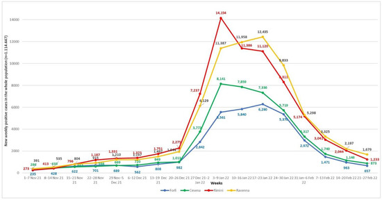 Weekly confirmed COVID-19 cases were divided according to Romagna territorial districts (Forlì, Cesena, Rimini and Ravenna) from 1 November 2021 to 28 February 2022.