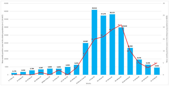 Weekly confirmed COVID-19 new cases from 1 November 2021 to 28 February 2022 in the general population (blue bars) and in dialysis patients (red line) of Romagna territory.