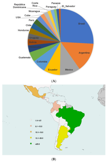 (A) Relative percentage of participating members of every country from Latin America. (B) Percentage of participating members from each country in relation to the total number of participants from all Latin American countries.
