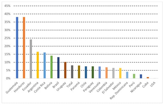 The highest rate of physicians completing the survey were those from Brazil (27.4%), Argentina (15.2%), and Mexico (10.7%) (Figure 1A,B). In most countries (16/19), participation was higher than 5% of the national membership of anesthesiologists (Figure 2).