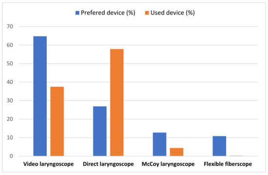 Respondents’ opinions on device preference indicated that the optimal device for intubation in patients with COVID-19 was the video laryngoscope (64.8%), followed by the direct laryngoscope (26.9%) (Table 3, Figure 5). The preferred type of video laryngoscope was as follows in descending order: C-MAC, King Vision, McGrath, Glidescope, and Airtraq (Figure S1); other laryngoscope characteristics are described in Table 3. Moreover, for the most preferred devices to facilitate intubation, the participants chose in decreasing order: Eschmann guidewire, flexible stylet inside the endotracheal tube, Frova guidewire, fiberscope, and finally, the VAMA cannula (Table 3).