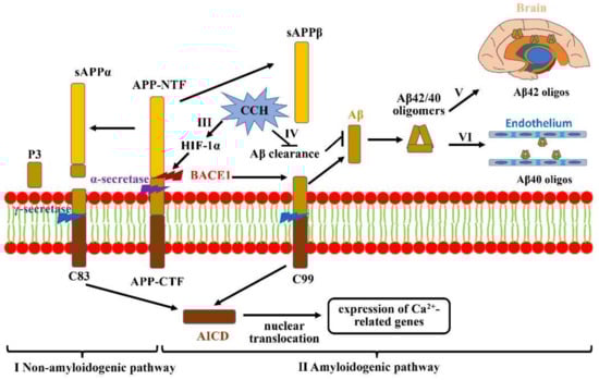 Aβ accumulation and aggravation under CCH. (I) Non-amyloidogenic pathway: APP is first cleaved by α-secretase to generate sAPPα and C83. C83 then produces P3 and AICD under the action of γ-secretase, which is shifted to the nucleus to regulate Ca2+-related gene expression. (II) Amyloidogenic pathway: full-length APP can also be cleaved by BACE1 to release soluble APPβ from the cell membrane and retain C99. Subsequent cleavage of C99 by γ-secretase generates Aβ42/40. (III) CCH-mediated hypoxia can promote BACE1 gene expression by upregulating HIF-1α. (IV) CCH is also likely to increase Aβ accumulation via impairing Aβ clearance. (V) The more aggressive Aβ42 tends to deposit in vulnerable brain regions that are primarily associated with learning and memory. (VI) Aβ40 prefers to deposit in non-neuronal cells, mainly including cerebral vessels.