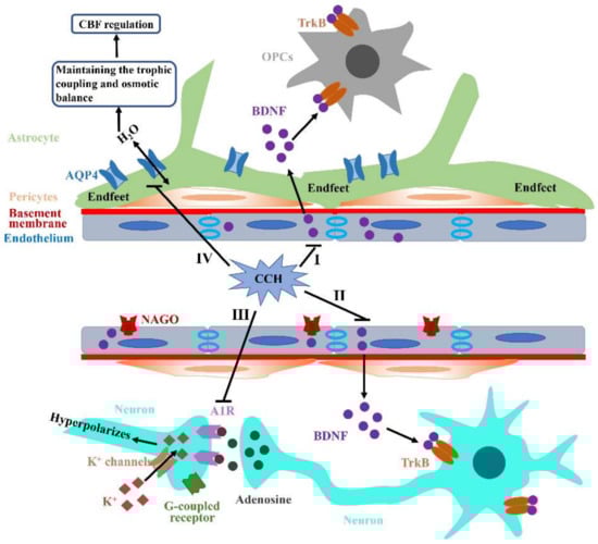 All kinds of cells in the NVU are in a state of close, mutual trophic and metabolic dependences, which ensures the normal physiological processes in the brain. For example, endothelium in the NVU have an ability to promote neuroblast migration along blood vessels and secret abundant brain-derived neurotrophic factor (BDNF) to promote the proliferation and survival of oligodendrocytes and neurons (Figure 3I,II) [77,78,79]. Meanwhile, astrocytes and pericytes are essential for the development and maintenance of endothelial barrier function [80]. Therefore, damage to any type of cells in the NVU would disrupt trophic coupling and also have deleterious effects on the other cell types. Previous studies revealed an impaired neurovascular coupling in the CCH rodent models, and there were interactions between these CCH-mediated pathological alterations, including astrogliosis, significant neuronal loss, inflammation, angiogenesis and neurogenesis, which further indicated NVU remodeling greatly affects various neurological functions [81]. Tropomyosin-receptor Kinase B (TrkB) is an endogenous receptor of BDNF and the combination of these two substances can contact the endothelium and neuroblasts. N-acetylglucosamine oligomers (NAGOs) are generally considered as specific markers of a mature vascular endothelium. Both BDNF/TrkB and NAGO/BDNF double-fluorescent staining can be used to reflect the endothelial neuroprotective support for neurons [82]. J. Shang et al., observed that double-fluorescent intensities of BDNF/TrkB and NAGO/BDNF were significantly reduced in CCH models, indicating that CCH impaired the trophic support for neurons from endothelium (Figure 3I,II) [83]. Additionally, CCH also remarkedly influences the NVU’s functional integrity through impairing the baseline tone in parenchymal arterioles, especially at 28 days post-BCAS surgery [84], in which Adenosine 1 receptor (A1R) plays an important role. A1R activation can trigger the neuron hyperpolarizes in the post-synapse through G-protein coupled inwardly rectifying K+ channels [85]. However, previous studies have revealed that A1R is significantly decreased in CCH mice models at 14 days post-surgery (Figure 3III). Meanwhile, adenosine, an inhibitor of neuromodulator, can react with A1R to induce hyperpolarization via the reduction of Ca2+ influx and neurotransmitter release, which is also detected in CCH mice models [84].