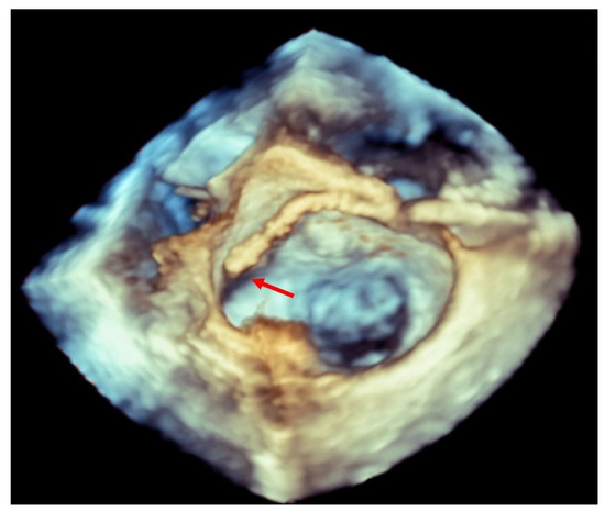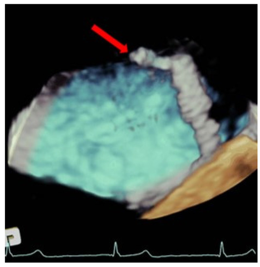 Three-dimensional transesophageal echocardiogram showing a clip inside the left atrium touching the lateral wall (red arrow).