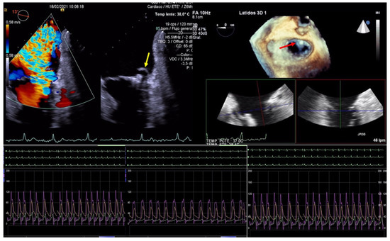 Persistent MR is an important prognostic factor for both mortality and rehospitalization in the follow-up of patients with mitral clip implantation [9,14]. Undoubtedly, TEE is the technique that allows for the real-time assessment of residual mitral regurgitation after clip implantation, allowing for grasping optimization, as well as the implantation of more than one device to achieve the best possible result with minimal residual regurgitation [2]. An accurate quantification of residual MR is of great importance; however, this is difficult since, after the implantation of one or several clips, the mitral valve became a valve with two or more orifices and several residual and often eccentric jets tend to remain. A recently published guideline provides complete information about the quantification focus on the fact that the evaluation of residual MR requires the careful integration of multiple parameters, as no single parameter is sufficiently accurate to assess the MR severity post-clip. In addition, it is important to compare post-procedural parameters to preprocedural baseline images and to evaluate them under the same hemodynamic conditions, which can help to evaluate the change in MR severity [15]. Three-dimensional TEE was graded as superior to 2D-TEE for the quantification of residual mitral regurgitation and the position relative to the residual regurgitant jet after clip arm closure [13]. Despite 3D vena contracta assessment being useful according to some authors [16,17], it is currently not fully validated.