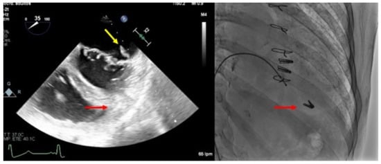 Even though the rate of thromboembolic events is anecdotic and usually multifactorial, thrombus forming in the delivery system can have devastating consequences and should be prevented by targeting a high level of anticoagulation (with an activated clotting time between 250 and 300 s) and by constantly flushing the delivery system. Some cases of post-procedural thrombus formation in the left chambers have been reported, probably related to blood stasis after the disappearance of the mitral regurgitation jet and with long procedures [11,12]. TEE is very useful in the early detection of thrombi adhered to catheters, which allows us to act quickly by withdrawing them by intensifying anticoagulation. (Figure 2).