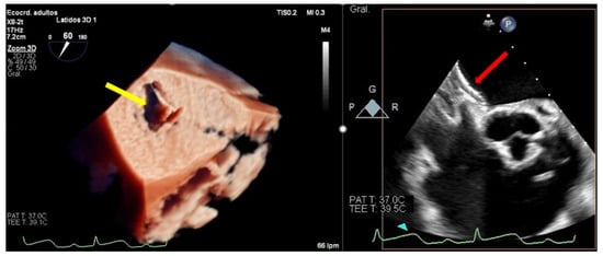 Persistent atrial septal defect. (Left) Three-dimensional transesophageal echocardiogram image showing a large atrial septal defect with tearing of the tissue through the transseptal puncture area (yellow arrow) from the left atrium. (Right): Two-dimensional transesophageal echocardiogram showing an Amplatzer device closing the iatrogenic atrial septal defect (red arrow).