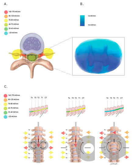 Transspinal magnetic stimulation induced electric fields, as suggested by the exploratory literature and computational models. (A). Generated current is concentrated on neuroforamina with estimated three to ten-fold greater intensity than at the spinal cord. (B). Current distribution in the spinal cord favors the posterior column, sparing the anterior horn and antero-lateral columns. (C). Generated current orientation on neuroforamina and spinal canal depends on coil type and positioning. Intraspinal transversal currents are substantially weaker than longitudinal currents when generated with similar coils. Root stimulation is optimal, leading to lower resting motor threshold and higher peak amplitudes when induced current is better aligned with the neuroforamina (orange and red arrows), preferably in an outwards direction (red arrow). mV/mm: millivolts per millimeter.