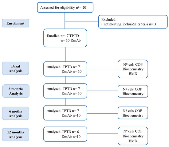 Flow diagram of the longitudinal study design. TPTD = Teriparatide; DmAb = Denosumab; COP = Circulating osteogenic precursor; BQ = Bioquimical determinations; BTM = Bone turnover markers; BMD = Bone mineral density.