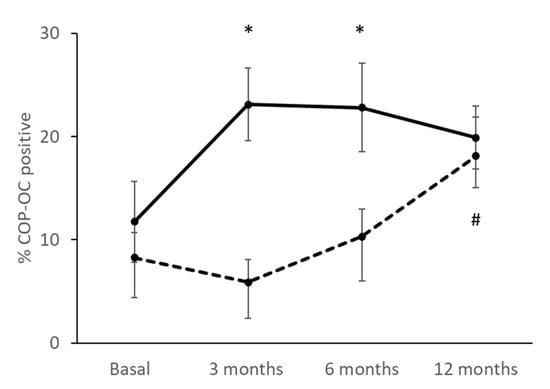 Tracking of % COP (OCN+) in each treatment group: Teriparatide (TPTD, solid line; n = 7) (basal vs. 3 months and basal vs. 6 months * p < 0.05) and Denosumab (DmAb, dashed line; n = 10) (basal vs. 12 months # p < 0.05).