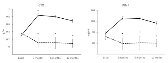 BTMs levels (CTX and P1NP) during TPTD (solid line; n = 7) and DmAb (dashed line; n = 10) treatment (basal vs. treatment: * p < 0.05).