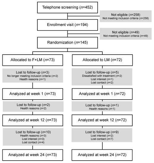 A total of 452 patients were telephone screened, and 258 were excluded because they did not meet the inclusion criteria (Figure 1). A total of 49 patients were excluded after medical assessment. A total of 145 patients were enrolled after providing informed consent and were randomized to the F + LM group (n = 73) or the LM group (n = 72). During the study period, 15 patients each were omitted during follow-up in the F + LM and LM groups (Figure 1). Participants’ mean age was 59.7 ± 9.3 in the whole study population (Table 1) and about two-thirds of the participants were female, one-third of those having a university degree. Baseline characteristics were balanced between groups. Patients had a BMI of 33.3 ± 4.5 kg/m2 (Table 1). Patients in the F + LM group attended a mean of 8.2 ± 2.3 (82.0%) out of 10 possible intervention sessions; patients in the LM group attended 7.1 ± 3.5 (71%) sessions (p = 0.124).