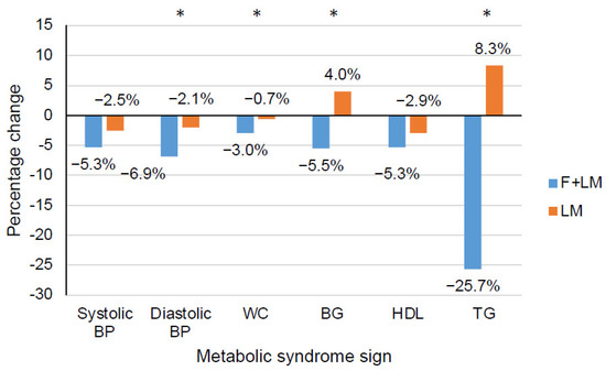 Percentage change in diagnostic signs of the metabolic syndrome after the 5-day fasting period (F + LM) or 5-day waiting period (LM). Abbreviations: BG, blood glucose level; BP, blood pressure; F + LM, fasting and lifestyle modification; HDL, high-density lipoprotein cholesterol; LM, lifestyle modification; TG, triglycerides; WC, waist circumference; *, p < 0.05.
