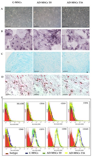 Representative images for Mesenchymal Stem Cells (MSCs) characterization. (A) Phase-contrast images of MSCs derived from skin of healthy control subject (C-MSC) and of patients with atopic dermatitis (AD-MSC) before (T0) and after (T16) treatment with Dupilumab. Scale bar: 100 µm; (B) Osteogenic differentiation, ALP staining, Scale bar: 50 µm; (C) Chondrogenic differentiation, Alcian blue staining, Scale bar: 200 µm; (D) Adipogenic differentiation, Oil red staining, Scale bar: 200 µm; (E) Flow cytometry analyses of cell-surface antigen expression, as indicated. Red histograms refer to the negative control (IgG1 isotype control–fluorescein isothiocyanate (FITC) labeled). Blue histograms: C-MSCs; Green: AD-MSCs T0; Yellow: AD-MSCs T16.