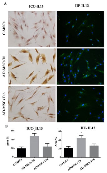 Analysis of the expression of IL13 by Immuno-cytochemistry (ICC), and indirect immune-fluorescence (IIF). (A) Representative images of IIF and ICC of IL13 on MSCs from healthy controls (C-MSCs), and MSCs from patients with AD (AD-MSCs) at T0 and at T16. For IIF, a secondary FITC-conjugated antibody was used after incubation with the primary antibodies. Nuclei were counterstained with Hoechst 33342. For ICC, slides were treated with 3,3-diaminobenzidine and counterstained with Mayer’s hematoxylin. (Scale bar: 100 µm). (B) Quantification of proteins expression processed by Fiji-ImageJ. Protein expression is represented by the percentage of the area it occupies inside the cell. The * indicates significative differences of C-MSCs vs. AD-MSC (unpaired t-test; p < 0.05).