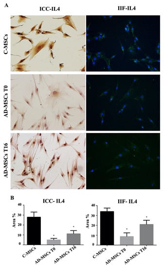Analysis of the expression of IL4 by Immuno-cytochemistry (ICC) and indirect immune-fluorescence (IIF). (A) Representative images of IIF and ICC of IL4 on MSCs from healthy controls (C-MSCs), and MSCs from patients with AD (AD-MSCs )at T0 and at T16. For IIF, a secondary FITC-conjugated antibody was used after incubation with the primary antibodies. Nuclei were counterstained with Hoechst 33342. For ICC, slides were treated with 3,3-diaminobenzidine and counterstained with Mayer’s hematoxylin. (Scale bar: 100 µm). (B) Quantification of proteins expression processed by Fiji-ImageJ. Protein expression is represented by the percentage of the area it occupies inside the cell. The * indicates significative differences of C-MSCs vs. AD-MSC (unpaired t-test; p < 0.05).