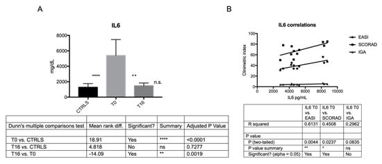 The value of IL-6 as therapeutic target in several inflammatory and immune mediated has been postulated on psoriasis [] and on atopic dermatitis, as demonstrated by data on Tocilizumab, a humanized monoclonal antibody directed against the IL-6 receptor, which in three case series demonstrated efficacy on pruritus and EASI index, in patients refractory to topical corticosteroid therapy and, in two cases, to cyclosporine [].