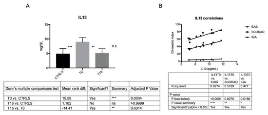 IL6 and IL13 were more secreted by AD-MSCs than C-MSCs at T0, and their secretion was directly correlated with disease severity at baseline, according to clinometric indexes EASI, SCORAD and IGA (except for IL6 and IGA) (Figure 4 and Figure 5). The secretion of IL6 and IL13 was significantly reduced after 16 weeks of treatment with Dupilumab, reaching levels closer to controls (Figure 4 and Figure 5; Table 3).