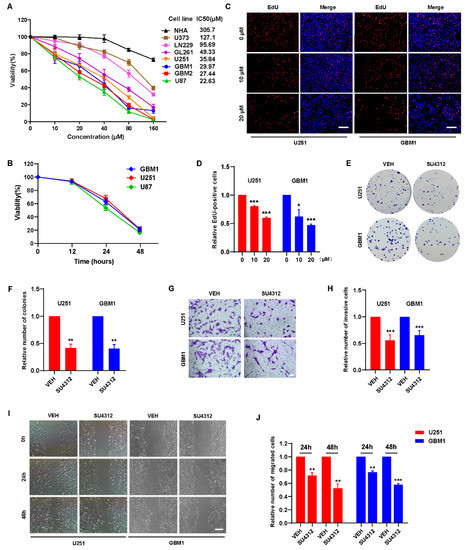SU4312 inhibits the proliferation, invasion and migration of glioma cells. (A). CCK-8 assay of seven glioma cell lines and normal human astrocytes treated with different concentrations of SU4312 for 24 h and the IC50 values of each cell line were calculated. (B). CCK-8 assay of three SU4312-sensitive glioma cell lines treated with 20 μM of SU4312 for 0, 12, 24 and 48 h. (C,D). Representative images (C) and quantitative results (D) of EdU incorporation assay in U251 and GBM1 cells treated with the indicated concentration of SU4312. Scale bar: 200 μM. (E,F). Representative images (E) and quantitative results (F) of colony formation assay after U251 and GBM1 cells treated with SU4312 at 10 μM. (G,H). Representative images (G) and quantitative results (H) of invasive cells after U251 and GBM1 cells treated with SU4312 at 10 μM. Scale bar: 50 μM. (I,J). Representative images (I) and quantitative results (J) of migratory cells after U251 and GBM1 cells treated with SU4312 for 0, 24 and 48 h at 10 μM. Scale bar: 100 μM. * p < 0.05, ** p < 0.01, *** p < 0.001.