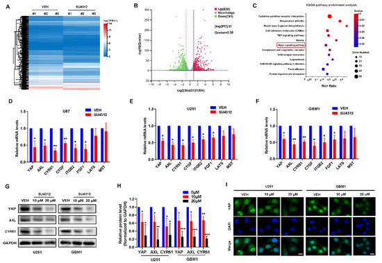 To investigate the molecular mechanism of SU4312 inhibiting glioma cell growth, we examined the expression of genes in vehicle- and SU4312-treated cells using high-throughput RNA-sequencing (RNA-seq) analysis (Figure 2A) and screened 1371 DEGs, of which 741 genes were down-regulated and 630 were up-regulated after SU4312 treatment (Figure 2B). The KEGG annotation and pathway enrichment analysis of these DEGs showed that the hippo signal pathway, which we studied for several years, significantly changed after SU4312 treatment (Figure 2C). YAP, the core effector of the hippo signal pathway, was significantly down-regulated. To verify this result, we used qPCR to detect the mRNA level of YAP and its upstream kinases MST and LATS, as well as its target genes AXL, CYR61, CTGF, ITGB2 and FGF1 in U87, U251 and GBM1 cells. The results showed that the mRNA level of MST or LATS showed no change, while those of YAP and its target genes were significantly down-regulated (Figure 2D–F), suggesting that SU4312 inhibits the transcription of YAP. In addition, the protein levels of YAP, AXL and CYR61 significantly decreased in U251 and GBM1 cells after SU4312 treatment (Figure 2G,H). The fluorescence intensity of YAP in U251 and GBM1 cells decreased after SU4312 treatment, while the subcellular location of YAP showed no significant change (Figure 2I). The above results showed that SU4312 treatment inhibits the transcription and expression of YAP. Since YAP is a well-known tumor-promoting gene in gliomas [24,25,26,27,28,29], we speculate that SU4312 may repress the proliferation, invasion and migration of gliomas by inhibiting the transcription and expression of YAP.