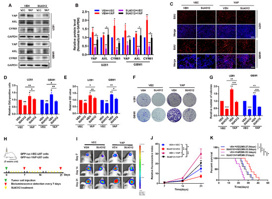 To demonstrate whether YAP is involved in SU4312′s inhibitory effect on gliomas, we constructed U251 and GBM cell lines that stably over-express wide-type YAP. The results showed that exogenous YAP partially restored the decrease in YAP and its target genes (AXL and CYR61) induced by SU4312 treatment (Figure 3A,B). When examined by EdU incorporation assay, CCK8 assay and colony formation assay, we found that the over-expression of YAP promoted the proliferation of U251 and GBM1 cells, and partially abolished the inhibitory effect of SU4312 on glioma cell growth (Figure 3C–G). Additionally, in order to explore whether YAP is involved in the inhibitory effect of SU4312 on glioma growth in vivo, we constructed an intracranial orthotopic transplanted tumor model (Figure 3H). U87 cells labeled with GFP-luciferase, with or without YAP over-expression, were implanted into the brain of nude mice, and animal in vivo imaging was performed on day 7, 14 and 21. Twenty-one days after implantation, the tumor size of the SU4312 treatment group was smaller, while that of the YAP over-expression group was larger than that of the control group. As expected, the over-expression of YAP partially eliminated the antitumor effect of SU4312 (Figure 3I,J). Meanwhile, Kaplan–Meier analysis showed that the survival time of SU4312 group was longer, while that of the YAP over-expression group was shorter than that of the control group. In addition, the over-expression of YAP blocked the survival benefit of SU4312 on glioma growth (Figure 3K).