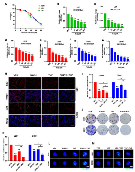 TMZ is the first-line drug for effective treatment of gliomas [31,40]. Since SU4312 can effectively cross the blood–brain barrier and has an obvious inhibitory effect on gliomas, we combined SU4312 with TMZ to observe whether they had a synergistic effect. First, we detected the cell viability of U87, U251 and GBM1 cells after different concentrations of TMZ treatment (Figure 4A) and found that the IC50 was 288.9 μM for U87 cells, 342 μM for U251 cells, and 333.6 μM for GBM1 cells, respectively. Then, we examined the cell viability by combining SU4312 (10 μΜ or 20 μΜ) with a gradually increasing TMZ concentration ranging from 0 to 200 μM (Figure 4B–G). As shown in Figure 4B–G, in three cell lines, the cell proliferation rate decreased after SU4312 treatment and was further inhibited when treatment was combined with different concentrations of TMZ. In addition, we calculated the combination index (CI) value of SU4312 and TMZ according to Compusyn [36,41] and found that SU4312 had a synergistic effect with TMZ in all three glioma cells for all CI values less than 1 (Table 2). Furthermore, when SU4312 (20 μΜ) was combined with TMZ (300 μΜ), either the number of EdU-positive cells or the colonies of the combination group were significantly lower than those of any single drug group (Figure 4H–K), suggesting that SU4312 and TMZ had a synergistic anti-proliferative effect on glioma in vitro. Moreover, p-H2AX immunofluorescence was used to detect therapy-induced DNA damage [42]. The results show that TMZ-induced DNA damage was enhanced by SU4312 treatment (Figure 4L). In contrast, TMZ-induced DNA damage decreased after the over-expression of YAP (Figure 4M). Hence, we speculate that SU4312 may have a synergistic effect with TMZ on glioma cell growth by down-regulating YAP and consequently increasing DNA damage.