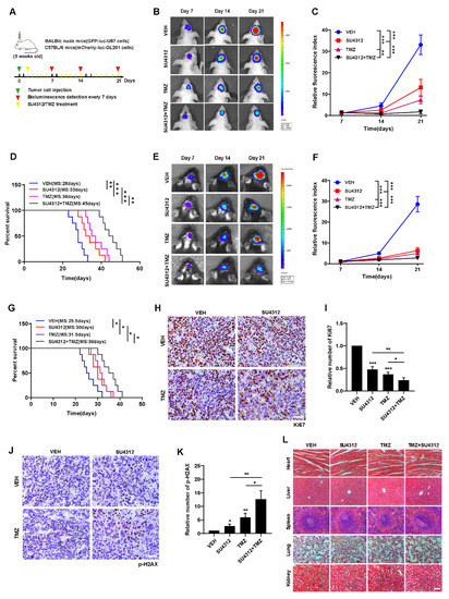 To evaluate the therapeutic efficacy of SU4312 combined with TMZ in vivo, we constructed intracranial orthotopic tumor models in immunodeficient (BALB/c nude mice) and immunocompromised mice (C57BL/6 mice), respectively (Figure 5A). As shown in Figure 5B,E and Figure 5C,F, the tumor size of the SU4312 and TMZ combination group was significantly smaller than those of monotherapy after 21 days of implantation, and the survival time of the SU4312 and TMZ combination group was significantly longer than those of monotherapy (Figure 5D,G). In addition, the number of Ki67 positive cells in the SU4312 combined with TMZ group was lower than those in the single drug treatment group, which further confirmed the synergistic effect of SU4312 and TMZ (Figure 5H,I). Meanwhile, the expression of p-H2AX in the combination group was higher than those of the TMZ or SU4312 monotherapy group, which also suggests that SU4312 could enhance the DNA damage induced by TMZ treatment in vivo (Figure 5J,K). Finally, using H&E staining, we did not observe any histopathological changes in the heart, liver, spleen, lung and kidney after SU4312 with or without TMZ treatment (Figure 5L). Taken together, the above results indicate that SU4312 may be a safe and effective drug for the treatment of glioma, and a potential sensitizer for TMZ both in vitro and in vivo.
