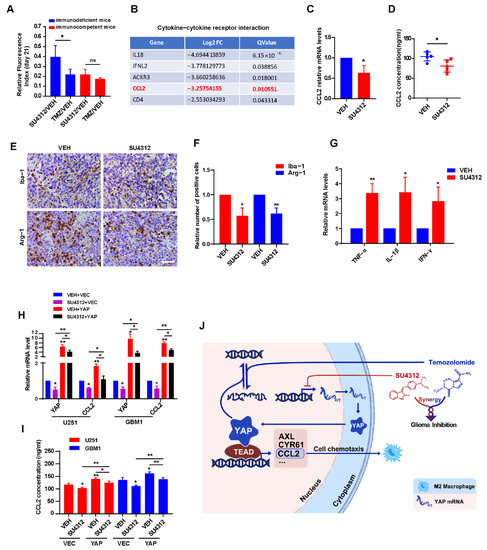 SU4312 inhibits CCL2 expression by down-regulating YAP, thereby improving anti-tumor immune microenvironment. (A). Quantitative analysis of the tumor size by relative fluorescence index after SU4312 treatment at 21 days after implantation between immunodeficient mice and immunocompetent mice. (B). In the “cytokine–cytokine receptor interaction” module, CCL2 was in the top five down-regulated genes after SU4312 treatment. (C,D). The mRNA and protein levels of CCL2 in tumor tissues in SU4312 and control group were detected by qPCR (C) and ELISA (D). (E,F). Representative images (E) and statistical results (F) show the changes in the proportion of Iba-1 and Arg-1 positive cells in SU4312 and control group detected by immunohistochemistry. Scale bar: 50 μM. (G). The immune-promoting cytokines (TNF-α, IL-1β and IFN-γ) in tumor tissues in SU4312 and control group were detected by qPCR. (H,I). The mRNA and protein levels of CCL2 in U251 and GBM1 cells treated with SU4312 with or without YAP over-expression were detected by qPCR (H) and ELISA (I). (J). Working model: SU4312 inhibits glioma progression by down-regulating YAP, sensitizes the antitumor effect of TMZ and promotes the formation of anti-tumor immune microenvironment. * p < 0.05, ** p < 0.01.