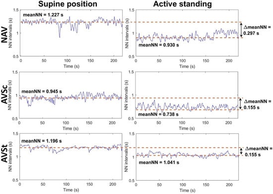 Example of HRV time series from one NAV subject (upper panels), one AVSc patient (middle panels) and one AVSt patient (lower panels) while they were in supine position (left panels) and active standing (right panel). The NAV subject is a 46-year-old man with a BMI of 25.565 kg/m2, a Vmax of 1.2 m/s, an AVA of 3.9 cm2, an AVAi of 2.02 cm2/m2, a PGmean of 2 mmHg, a PGmax of 5 mmHg and an LVEF of 60%. The AVSc patient corresponds to a 30-year-old-man with a BMI of 26.3 kg/m2, a Vmax of 1.05 m/s, an AVA of 4.2 cm2, an AVAi of 2.2 cm2/m2, a PGmean of 2 mmHg, a PGmax of 4 mmHg and an LVEF of 68%. The AVSt patient is a 53-year-old man with a BMI of 30.191 kg/m2, a Vmax of 5.6 m/s, an AVA of 0.5 cm2, an AVAi of 0.25 cm2/m2, a PGmean of 57 mmHg, a PGmax of 97 mmHg and an LVEF of 55%. MeanNN: mean value of all NN intervals in the time series, NAV: normal aortic valve, AVSc: aortic valve sclerosis, AVSt: aortic valve stenosis. ΔmeanNN: the difference between meanNN values at the supine position minus values at active standing.