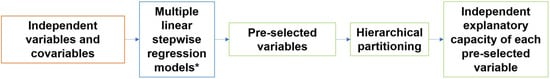 Before applying the hierarchical partitioning, multiple linear stepwise regression models were considered to select the variables in each category of independent variables and covariables. Table S1 in the Supplementary Materials shows the full description of selected variables for the time domain HRV indices.