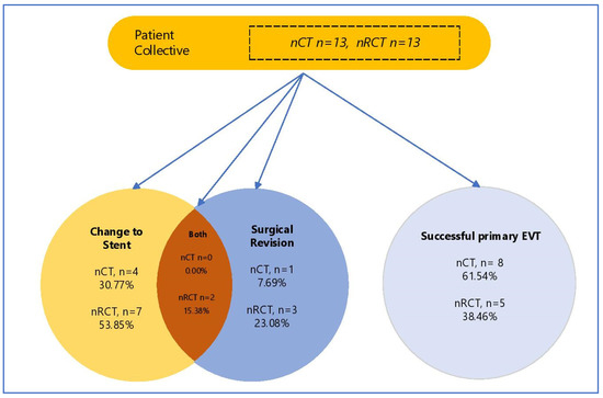 Further limitations of this analysis include the small number of patients and the retrospective design of the study. Differences in patient population were seen, including increased cardiovascular comorbidity in the nCT group as well as increased SCC in the nRCT group. These differences were, however, controlled for in weighting. Despite these limitations, our findings might have clinical implications regarding combined treatments such as the combination of stent and EVT treatment.
