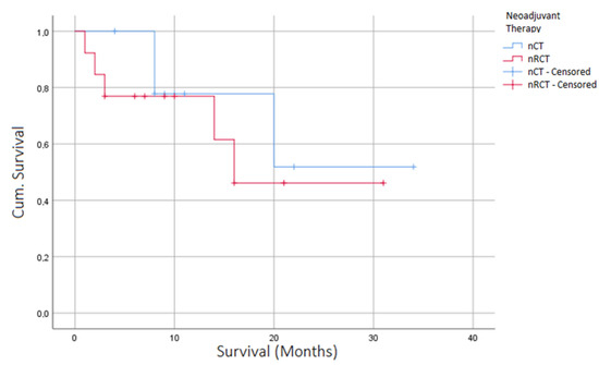 The perioperative 30 day mortality (nCT n = 0 (0.00%) vs. nRCT n = 1 (7.14%), p = 0.131) and 90 day mortality (nCT n = 0 (0.00%) vs. nRCT n = 1 (7.14%), p = 0.131) did not differ between the groups despite a significant difference in terms of tumor entity between the groups (SCC (n = 1, 7.69%) vs. nRCT (n = 9, 69.23%), p = < 0.001). With a follow up time of 30 months, no differences in overall survival were seen between the two groups (Figure 2). The median overall survival was 19.4 months for patients with nCT compared to 16.8 months for patients with nRCT-treated tumors (p = 0.864, Figure 2).