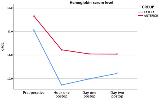 The hemoglobin serum levels before and after surgery are shown in Figure 1 for study group.