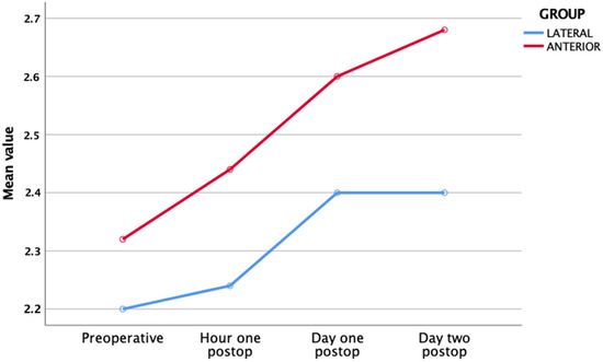 The data were recorded at the following times: T0 (one hour before the surgical procedure); T1 (one-hour post-surgery); T2 (24 h post-surgery); and T3 (48 h post-surgery).