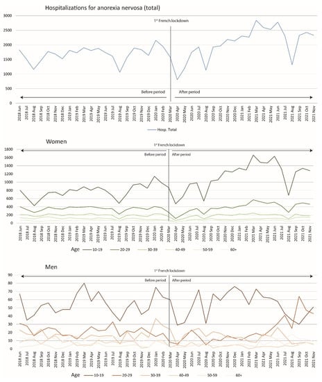 In terms of variations in hospitalizations for AN by age and gender, there was a similar decrease in hospitalizations among women aged 10–19 years and, to a lesser extent, among those aged 20–39 years at the beginning of the lockdown period, followed by an almost constant increase in hospitalizations until the end of the study period (with the exception of the summer periods in 2020 and 2021).
