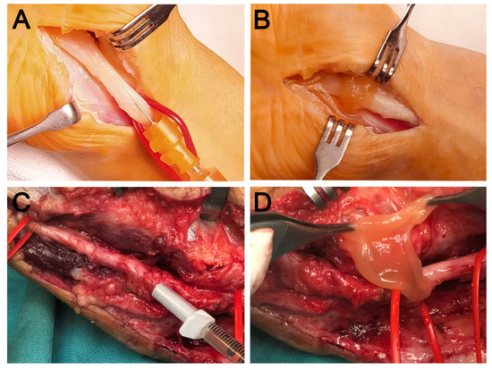 Representative images of two cases of nerve compression in the upper limb. Open surgical release of the carpal retinaculum (A,B) and of the ulnar epitrochlear ligament (C,D). In the case of the median nerve, intraneural PRGF (A) is applied after release and subsequently wrapped with a PRGF membrane (B). Similarly, in the case of the ulnar nerve, intraneural infiltration is performed after neurolysis (C), followed by the application of a PRGF fibrin membrane (D) in order to avoid postoperative fibrotic entrapment.