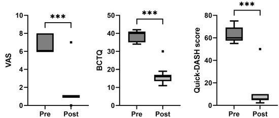 Box-and-whisker plots showing the results of the carpal tunnel syndrome for visual analogue scale (VAS), Boston Carpal Tunnel Questionnaire (BCTQ), and Quick-DASH score. The boxes show the median and interquartile range (IQR), and the whiskers indicate the 25th percentile −1.5 × IQR, and the 75th percentile −1.5 × IQR. The square points indicate outliers outside the whisker range. *** indicates p < 0.001 (n = 16).