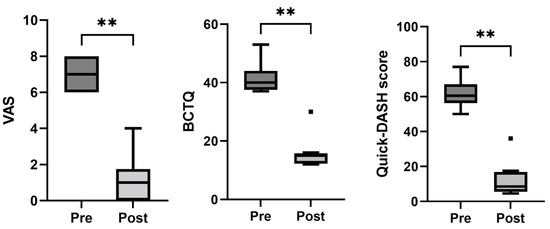 Box-and-whisker plots showing the results of the recurrent carpal tunnel syndrome group for visual analogue scale (VAS), Boston Carpal Tunnel Questionnaire (BCTQ), and Quick-DASH score. The boxes show the median and interquartile range (IQR), and the whiskers indicate the 25th percentile −1.5 × the IQR and the 75th percentile −1.5 × IQR. The square points indicate outliers outside the whisker range. ** indicates p < 0.01 (n = 8).