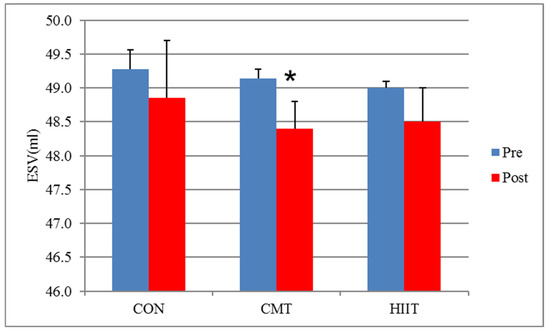 Results from pairwise comparison of the study groups did not reveal a significant increase in the LV ESDs of the CMT group compared with those of the control group before and after 12 weeks of training (