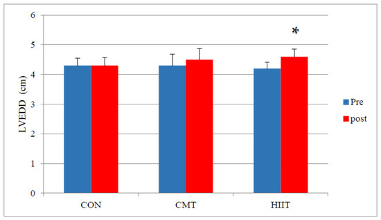 Figure 4). Similarly, the results showed a significant increase in the LV EDDs of the HIIT group compared with those of the CMT group before and after the 12-week training period (