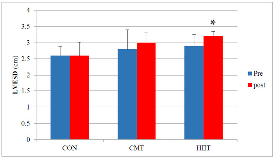 p = 0.01). Similarly, the results showed a significant increase in the LVESDs of the HIIT group compared with of those of the CMT group before and 12 weeks after the research design (