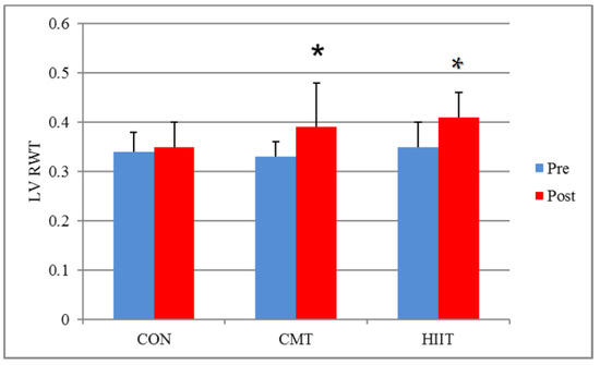 Figure 6). Similarly, the results did not show any significant difference between the LV RWTs of the HIIT and CMT groups before and after 12 weeks of training (