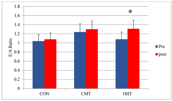 Results from the pairwise comparison of the study groups revealed a significant increase in the E/A ratio (as an indicator of left ventricle function) of the HIIT group compared with that of the control group before and after 12 weeks of training (