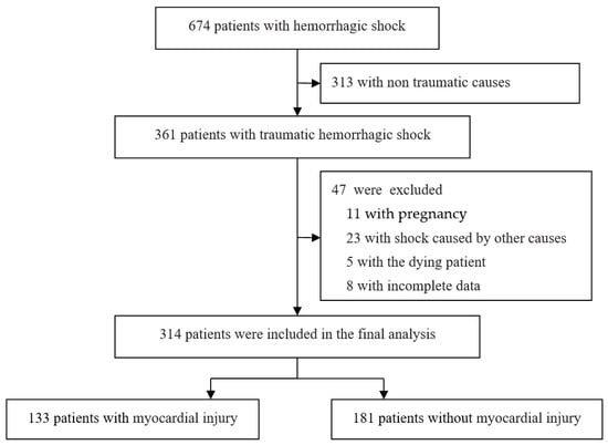 The primary outcome was the occurrence of myocardial injury after traumatic hemorrhagic shock. Myocardial injury after traumatic hemorrhagic shock was defined as myocardial injury caused by ischemia or hypoxia that may or may not result in necrosis after non-cardiac trauma and occurred after traumatic hemorrhagic shock. The definition of myocardial injury was cTNI concentrations above the 99th percentile upper reference limit (URL). The injury was considered acute if there was a rise and/or fall of cTNI values [11]. cTNI levels were assessed via high-sensitivity troponin I assay on a DxI800 (Beckman Coulter, Brea, CA, USA), wherein the 99th percentile for this test was 0.034 ng/mL. Myocardial injury mainly occurs within 7 days after traumatic hemorrhagic shock; therefore, we detected the cTNI level within 7 days after traumatic hemorrhagic shock. Myocardial infarction was defined as clinical evidence of acute myocardial ischemia with detection of a rise and/or fall of cTNI values with at least one value above the 99th percentile URL and at least one of the following: symptoms of myocardial ischemia; new ischemic electrocardiogram changes; development of pathological Q waves; imaging evidence of new loss of viable myocardium or new regional wall motion abnormality in a pattern consistent with an ischemic etiology; and/or identification of a coronary thrombus by angiography or autopsy (not for types 2 or 3 myocardial infarctions) [11]. For patients with myocardial injury after traumatic hemorrhagic shock, treatments such as control of bleeding, improvement of oxygenation and tissue perfusion, anticoagulation after control of bleeding, and cardiovascular drugs (e.g., antiplatelets, statins, beta-blockers, and angiotensin-converting enzyme inhibitors) were given according to guidelines for bleeding following major trauma and guidelines for myocardial infarction [12,13].
