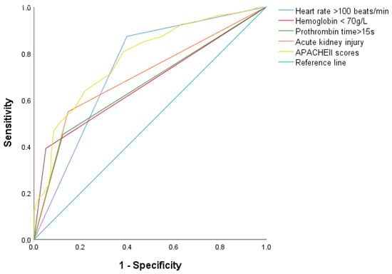 According to collinearity diagnostics, no correlation was found. As a result, none of the variables was removed. All statistically significant variables were enrolled into a logistic regression model using myocardial injury after traumatic hemorrhagic shock as the dependent variable (Table 2). The independent risk factors for myocardial injury after traumatic hemorrhagic shock were a heart rate of >100 beats/min (OR, 3.33; 95% CI, 1.56–7.09; p = 0.002), hemoglobin levels of <70 g/L (OR, 3.50; 95% CI, 1.15–10.60; p = 0.027), prothrombin time of >15 s (OR, 2.39; 95% CI, 1.12–5.10; p = 0.024), AKI (OR, 2.75; 95% CI, 1.27–5.93; p = 0.01), and a higher APACHE II score (OR, 1.08; 95% CI, 1.01–1.15; p = 0.018) (Table 3). The AUC for the prediction of myocardial injury after traumatic hemorrhagic shock was 0.67 (95% CI, 0.68–0.79) for a heart rate of >100 beats/min, 0.67 (95% CI, 0.61–0.73) for hemoglobin levels of <70 g/L, 0.66 (95% CI, 0.60–0.73) for prothrombin time of >15 s, 0.70 (95% CI, 0.64–0.76) for AKI, and 0.78 (95% CI, 0.73–0.83) for APACHE II scores (Figure 3), and good calibration was shown in a regression model (Hosmer–Lemeshow χ2 = 3.798; p = 0.875).