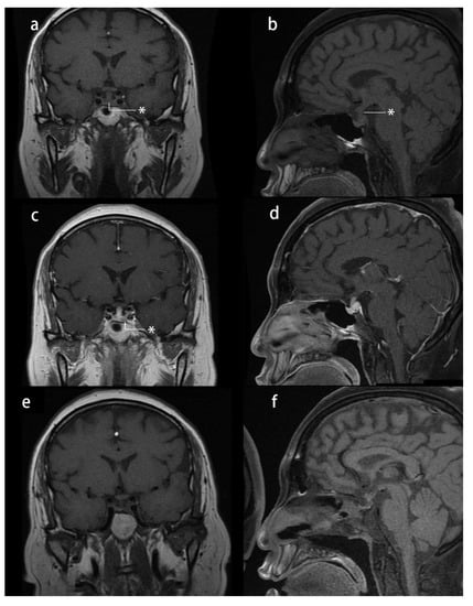 Presurgical and postsurgical pituitary MRI study of case 1: (a–d) presurgical MRI study: (a) T1-weighted image (T1-WI) coronal plane reveals a thickened pituitary stalk *; (b) T1-WI sagittal plane reveals a thickened pituitary stalk and loss of hyperintensity * of the T1 signal in the posterior pituitary gland; (c) T1-WI contrast-enhanced coronal plane reveals a hypointense nodule * in the left side of the pituitary gland; and (d) T1-WI contrast-enhanced sagittal plane reveals a thickened pituitary stalk; (e,f) one-year postsurgical MRI study: T1-WIs showing a thinner pituitary stalk and loss of hyperintensity of the T1 signal in the posterior pituitary gland.