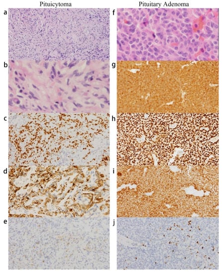 - Schmalisch, K.; Schittenhelm, J.; Ebner, F.H.; Beuschlein, F.; Honegger, J.; Beschorner, R. Pituicytoma in a patient with Cushing’s disease: Case report and review of the literature. Pituitary 2012, 15 (Suppl. S1), S10–S16. [Google Scholar] [CrossRef]