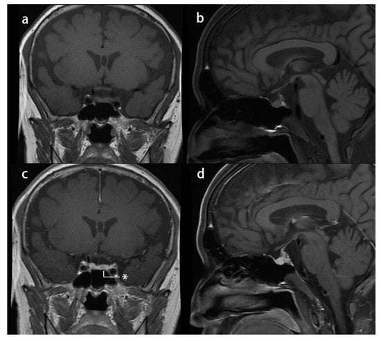 Presurgical pituitary MRI study of case 2: (a) T1-weighted image (T1-WI) coronal plane and (b) T1-WI sagittal plane showing a normal pituitary stalk without any nodule; (c) T1-WI contrast-enhanced coronal plane reveals a hypointense nodule* in the left side of the pituitary gland; and (d) T1-WI contrast-enhanced sagittal plane.