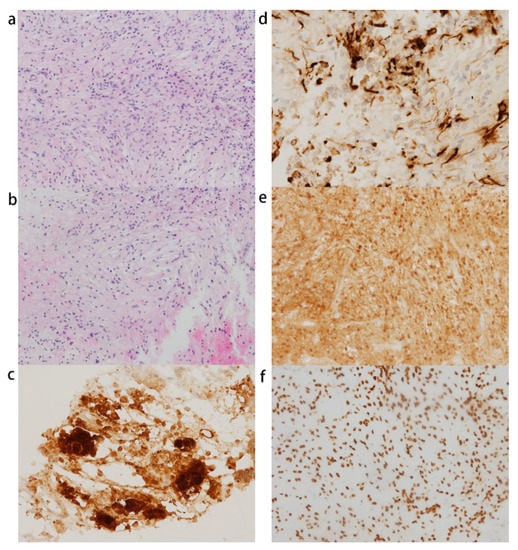- Chakraborti, S.; Mahadevan, A.; Govindan, A.; Sridhar, K.; Mohan, N.; Satish, I.; Rudrappa, S.; Mangshetty, S.; Shankar, S. Pituicytoma: Report of three cases with review of literature. Pathol. Res. Pract. 2013, 209, 52–58. [Google Scholar] [CrossRef] [PubMed]